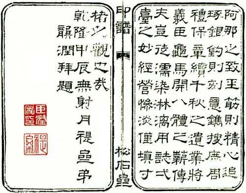《松石齋印譜》,開本高25.6公分,寬15.4公分,粉連紙木雕板雙線墨框,板框高20.5公分、寬11.8公分。書口上方刻隸書體“印譜”兩字,下刻有“松石齋”書名。卷首有乾隆甲辰年龔潤撰《<松石齋印譜>題辭》(題后有“臣潤私印”、“褆齋”款印二方,與正文同系木板雕刻印刷),卷末為唐璉之仲孫唐儉(以廉)的《<松石齋印譜>后跋》(正文系木板雕刻印刷,題跋后有“唐儉”、“福口氏”款印二方,系原印鈴蓋)。印譜正文均以原印用朱砂印泥鈐蓋本,計19頁(見圖1)。