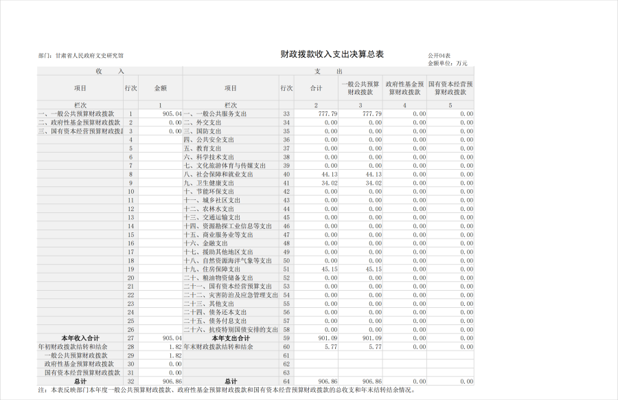2022年度財政撥款收、支總計均為906.86萬元。與上年相比,各減少10.79萬元,下降1.18%。主要原因是預算壓減故收支均壓減。